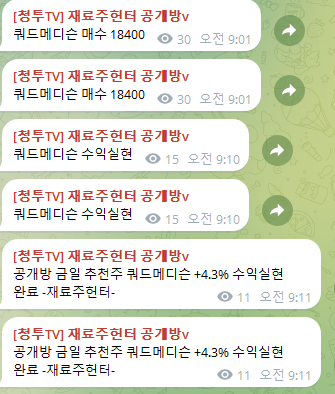 공개방 금일 추천주 쿼드메디슨 +4.3% 수익실현 완료 -재료주헌터-
