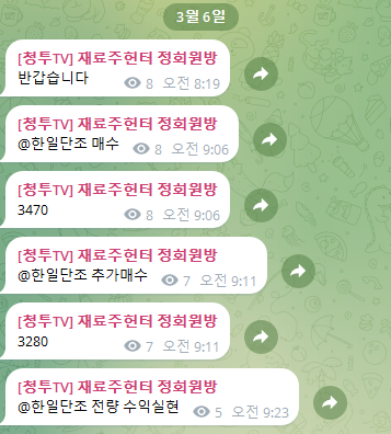 03.06 공개방추천주 에임드바이오 +5.5%, 정규방 신규매집 한일단조 +8.2% 수익실현완료 +