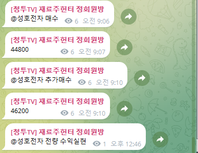 정규방 금일집중매집종목 성호전자 +10.2% 수익실현완료 -재료주헌터-