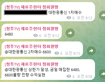 정규방 금일 집중매집종목 대한광통신 총 +19% 수익실현완료 -재료주헌터-