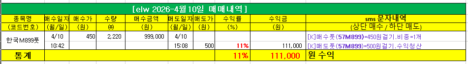| [김양균 대표] 오전에 매수했던 elw풋을 매도해 당일 단타로 11% 수익을 챙겼습니다. |