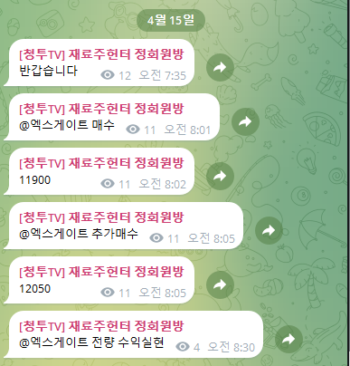 정규방 금일 오전 집중매집 엑스게이트 총 +12.6% 수익실현 달성 -재료주헌터-