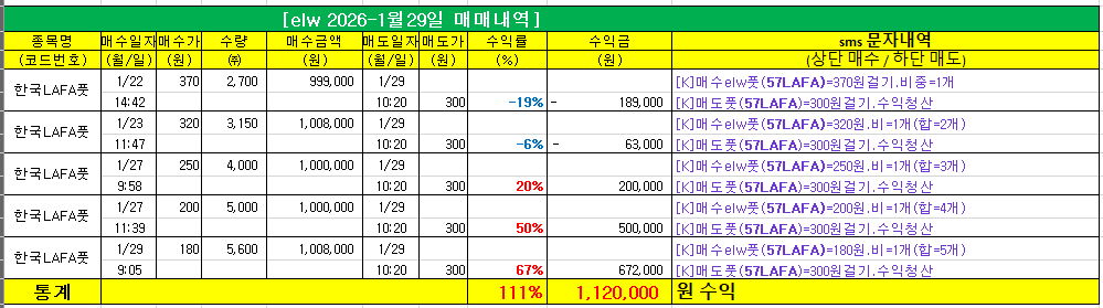 29일(목) elw 매매에서는 단타 매매로 5개 합=111% 수익을 챙겼습니다. 투자원금 1개(1개=100만원 기준)로 단타 대응해 112만원 수익이네요. 매수 걸기 후 매도 걸기를 제시해 직장인도 만족하는 리딩입니다. 하락장 상승장 상관없이 매일매일 수익 챙기는 안정적인 고수익 elw 매매 급등락장에서 더 큰 수익을 내는 elw 매매에 동참해 보십시오.